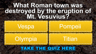 In this fun History quiz we're going to ask questions like "What Roman town was destroyed by the eruption of Mt. Vesuvius?" and "What was the name of the sheep cloned by British scientists in 1997?".